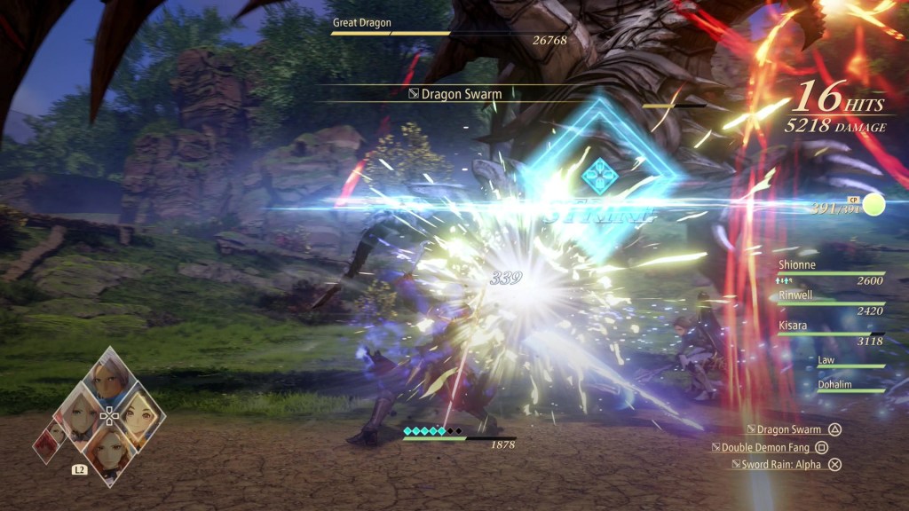 The plot to the story is a bit too deep to go into here, but mainly consist of the group led by Alphen on his travels to regain his memory and save his planet Dahna from the tyrannical overlords from the twin planet Rena. Throughout this journey you pad your party out with Shionne, Rinwell, Law, Kisara and Dohalim, which can all be party leaders and thus playable to free roam the areas and control in combat.