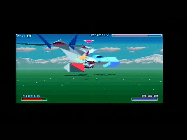The graphics on this are obviously blocky as fuck, but with the moving linear environment and only a slight lag delay it’s oddly pleasing to the eye. For the time and hardware it must’ve looked great when it initially came out. Like how Skyrim in 2011 was the Bee’s knees. It does come with some nice features though, bits fall of bosses, buildings collapse enemies, fall over causing a slight inconveince. The controls are receptive enough, with the shoulder triggers are used for rolling, the colour buttons control your laser, bomb, boost and brakes.
