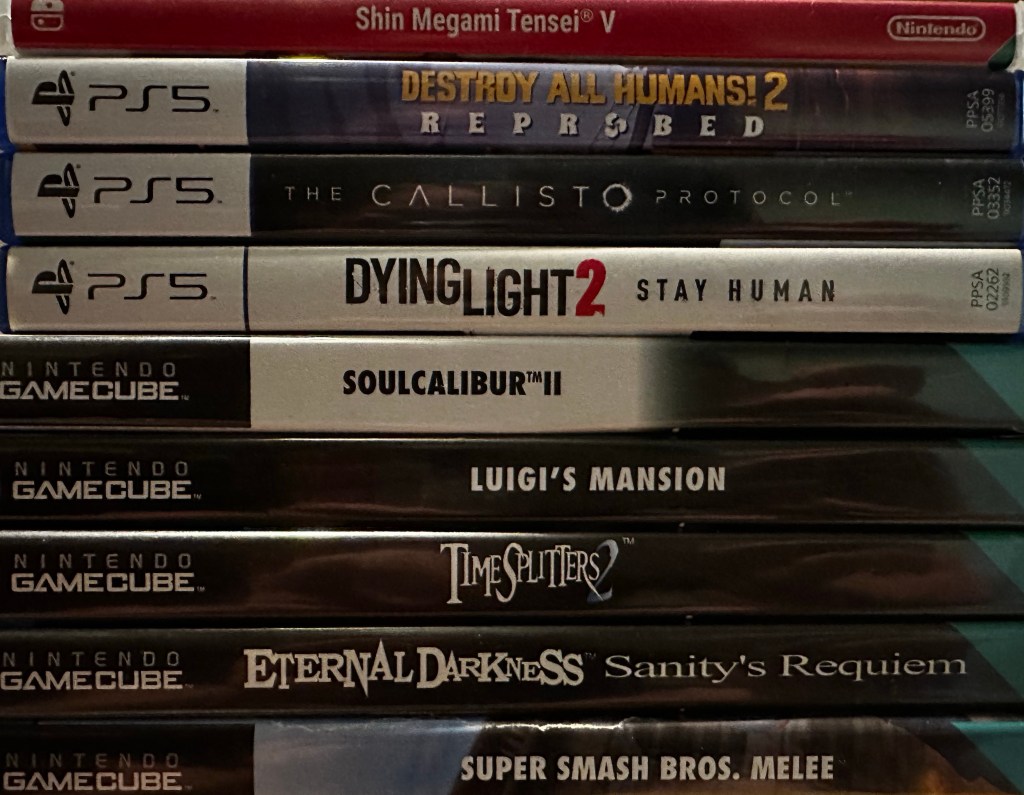 Then I will attempt to work my through this delightful stack. Which as you can see is an eclectic mix. From timesplitters 2, the super gorey Callisto Protocol and Dying Light 2 which i’ve holding off on getting for a while, all the way to Shin Megami Tensei 5. With a splashing of the original Luigis Mansion on the side, a gem of horror game in Eternal Darkness. Then Super Smash Bros Melee, and soul Calibur 2 which I already have on PS2 but that version is lacking the playable version of Link. And finally the remaster of Destroy All Humans 2 a personal favourite of mine from my youth.