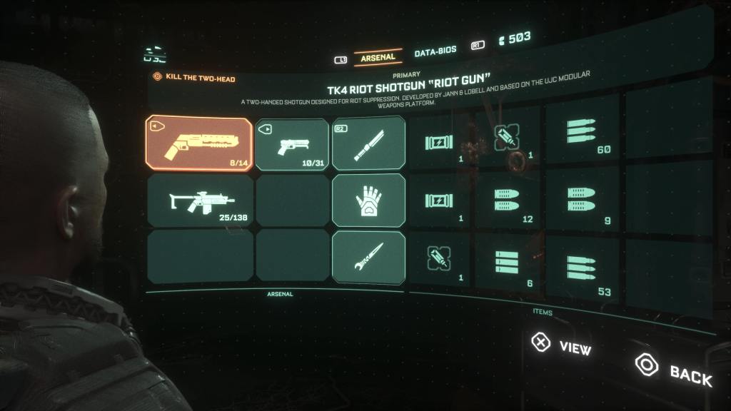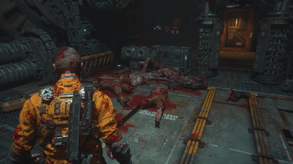 Oddly there are only really two bosses in this game a two-head which you fight four different ones I think it is, and Captain Ferris. As with the other enemies there is a healthy helping of body horror, and the whole facility is spread in blood and viscera. As well as guards in various states of mangled in most rooms. The gore in this game is heavy and might not be for everyone, and Jacob is no exception, with most of his death animation involving getting his head exploded or lopped in half, or if you are really lucky he might lose an arm. From the body horror and gratuitous violence, you get typical jump scares, you get constantly jumped from behind or some shit launching at you from around corner. For the most part it’s fairly standard and I think they could’ve amped it up a tad more. Another feature of this game is stealth kills, which again aren’t great, you crouch get behind them and stab them if the option flashes. This doesn’t work on most enemies as they clock you immediately and will run over to bitch slap you in the chops. You are also limited on carry capacity for half the game and it’s a bit bollocks, even once you get the suit which increases your health and carry capacity. It quickly becomes full of ammo, and I found I need a lot of health injectors which seemingly just stop being around for pick ups once you hit chapter 5. Where the enemies also die the same but for some reason begin to inflict a lot more damage, and with the slightly shit dodge system. When you are surrounded and killed off one enemy the next will pretty much just fuck you up before you can re-act. The two heads and Ferris will pretty much one shot you regardless of difficulty as well.