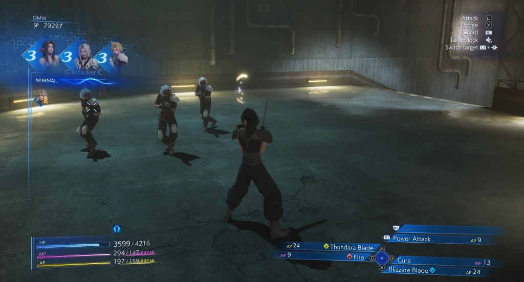 Combat in this game is alright, it’s not the best, if nothing else just a bit repetitive. You can attack, block dodge and lock on. Pretty standard stuff. You have a preset combo, which can’t be improved upon or added to, only changes slightly once you finally get tre buster sword in chapter 5. You use materia to do your magic attacks or slot in stat boosting ones instead. You still have materia fusion where you can upgrade existing moves with extra attack points or to merge together to make newer stronger attacks. What I do like about the combat in this game though as long as you’ve unlocked their image you have a mini slot machine going in the top left. This allows for summons and for high damage special attacks kinda like if you had a support summon trigger. These in some of the boss fights are indispensable.