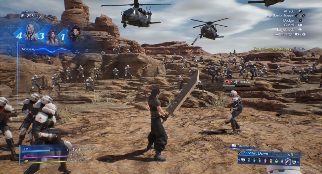 The game itself isn’t very long, you’ll clock in around 12-15 hours to just do the main story, which for if you don’t know is the story of 7. This is the prequel explaining how and who Clouds memories get smushed up with, in his slight PTSD state of being. You play as Clouds mentor and friend Zack Fair, with some returning support characters in the Turks, Aerith and Sephiroth, the one winged angel himself, popping up throughout the run of the game. The main meat of the game though comes in at the side quest or missions. Now this sits a nice and hefty 300 missions to work through. This will really add a lot of extra playtime on if that’s your sort of thing. Most of these don’t take long to do just a couple minutes a pop. I did stop at the 44% mark and just carried on with the story. I may one day return to do a platinum run on this game, as that doesn’t seem particularly difficult. I just couldn’t be fucked to do another 150+ missions. These all take place in mini dedicated areas, which have loot boxes scattered around which keeps you topped up of potions and accessories. So for the most part you don’t need to use the in game shops it’s just a waste of gil. All play out the same find the mini boss fight, trigger it and kill them fuckers dead.