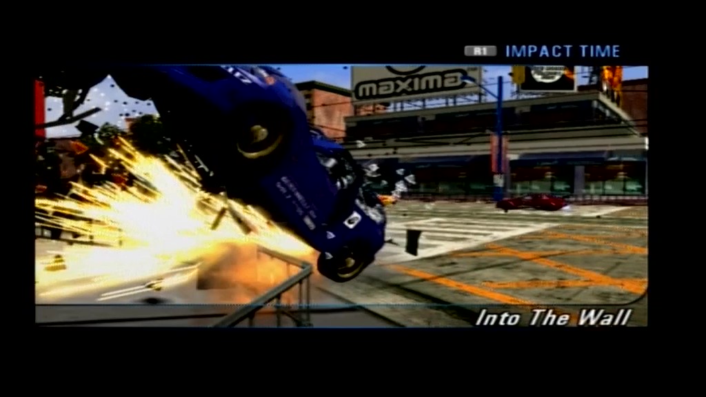 Again, back to the review I digress once more. The gameplay doesn’t need to be mentioned all that much it’s an arcade racer. At it’s core, it’s like any base racing game, and with any other title it gets spiced up in their own way. In this case it’s the carnage. I love it. It’s definitely the biggest strength of the game, but sometimes it’s also a detriment. This could be from just the games age showing through, meaning the driving isn’t as flush and receptive as the modern day counterparts, and with the base cars turning and drifting is the drizzling shits. What normally happens is I just plough into oncoming traffic, a pillar or head first into a blocked off section. As I said it could be the driving or it could be that I am just dog shit at the game, who’s to say. Don’t get me wrong the driving isn’t horrendous and works well enough, you can tell the difference between cars. The tracks aren’t massively populated but the longer trucks and buses can be a real pain in the arse though. Along with standard races, you get time trials, preview laps, face offs, road rage and crash mode. The last two being the best versions. The aim to make your opponents crash the most through take-downs and slamming them in a standard race setting. With crash mode, get some pick ups and then ram into traffic and just exploding the ever loving shit of everything in the vicinity for the highest cost from damage caused.