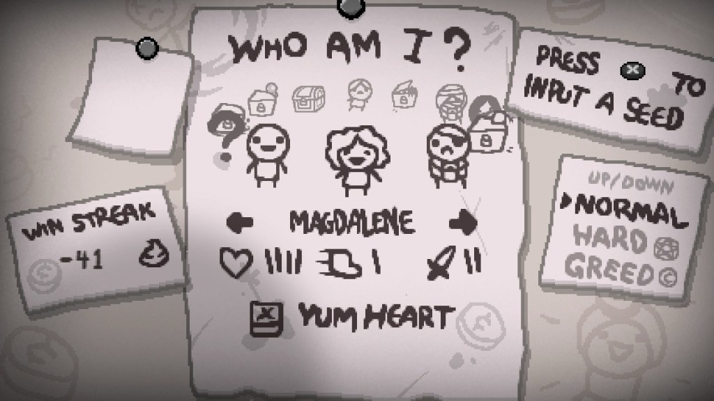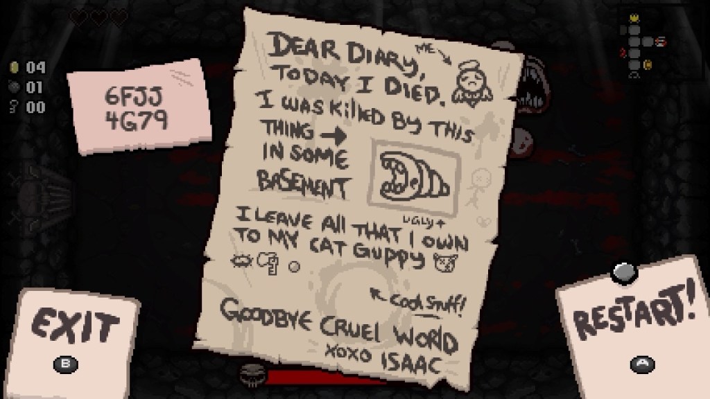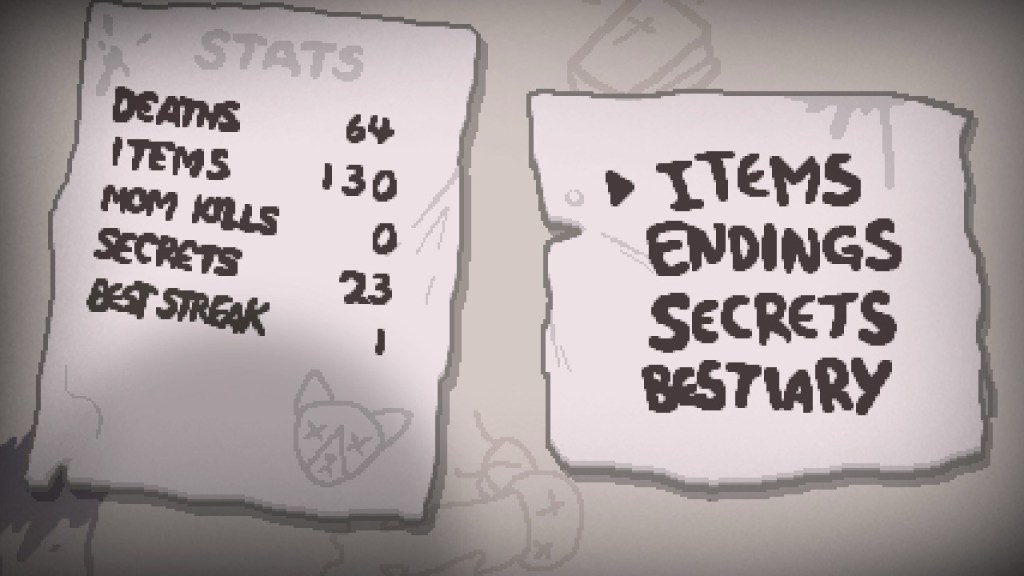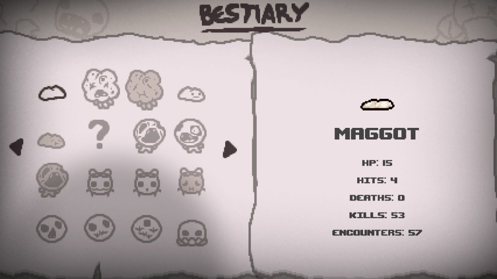 I am aware of the final DLC in repentance which adds even more of everything and I’ve been tempted to get it but whilst getting back into this game I think I’ll leave it a while longer. As I’ve got around 10 more endings to unlock, however many characters still. I’ve only filled out about half the bestiary and a third of the items, not to mention the alternate difficulty options and challenge modes I can run through still. For a game if you know what’s what, it won’t take you long to complete around 40 mins I’d say. It’s loaded with re playability, even more so than a lot of similar games. However with the weird horror and brutality of this game, along with it’s hundred of items and enemies its a real standout.