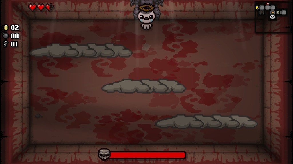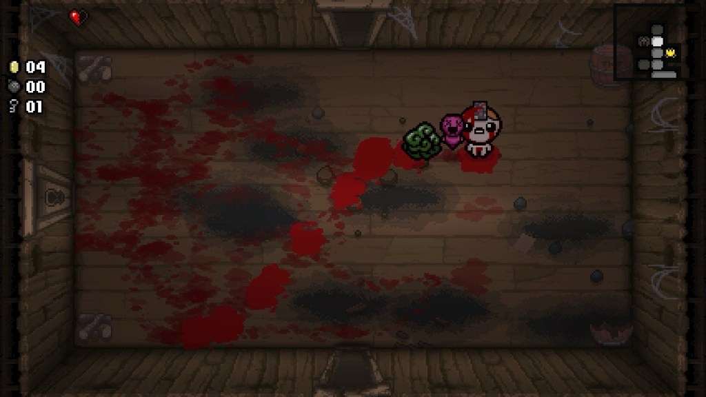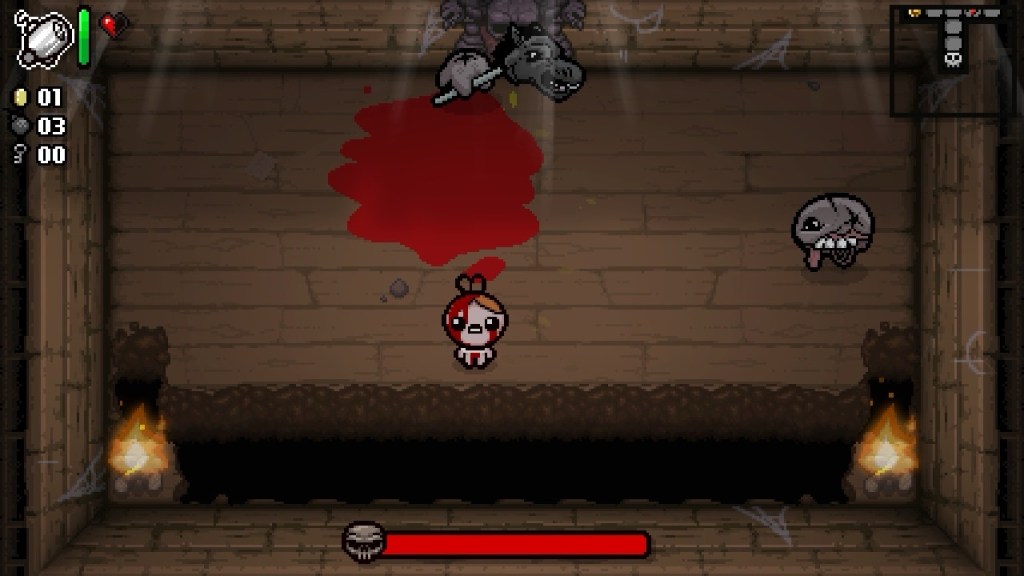 Now the unknown in this case are random procedurally generated dungeons, which contain all sorts of enemies. From floating heads, headless bodies, flies, masses of flesh, poisonous spiders, even literal turd monsters along worm looking things that pop up through the floor and that’s just the tip of what you can run into. Most of them have variations that spew poison rather the shoot blood at you, and some may explode causing further damage, turn into other enemies or spew more out of themselves. You defeat these creatures by shooting tears at them, in a twin stick shooter fashion. Now along with basic enemies you have bosses. Which you have to defeat at the end of each level to progress. However with this being the sort of game it is you can easily run into multiple bosses just as you make your way through the rooms. Within the rooms as well are hidden chests, fires, spiked floors, piles of shit which along with the rubble you can destroy for items.