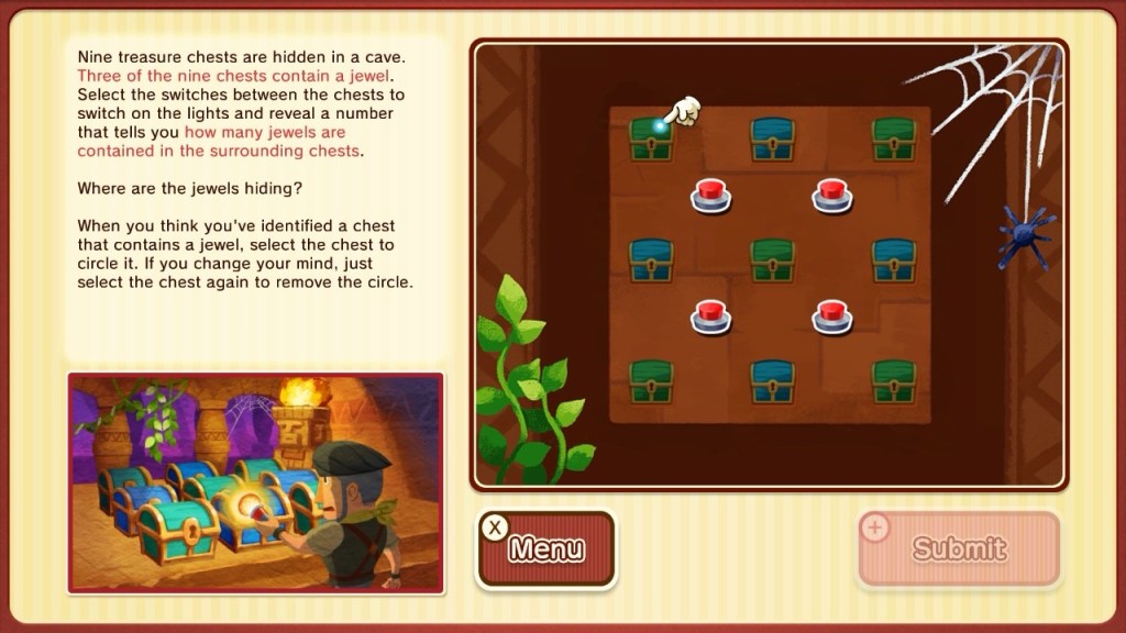 I think collectively with daily puzzles there’s something like 550 puzzles to work though, as well as three mini games you can do at any time. One is finding the perfect four course meal for some supporting characters. You have the mini maze game for Sherl where you have to get to the exit in a required amount of moves. And lastly the shop game where you have to direct customer to purchase everything in your inventory.