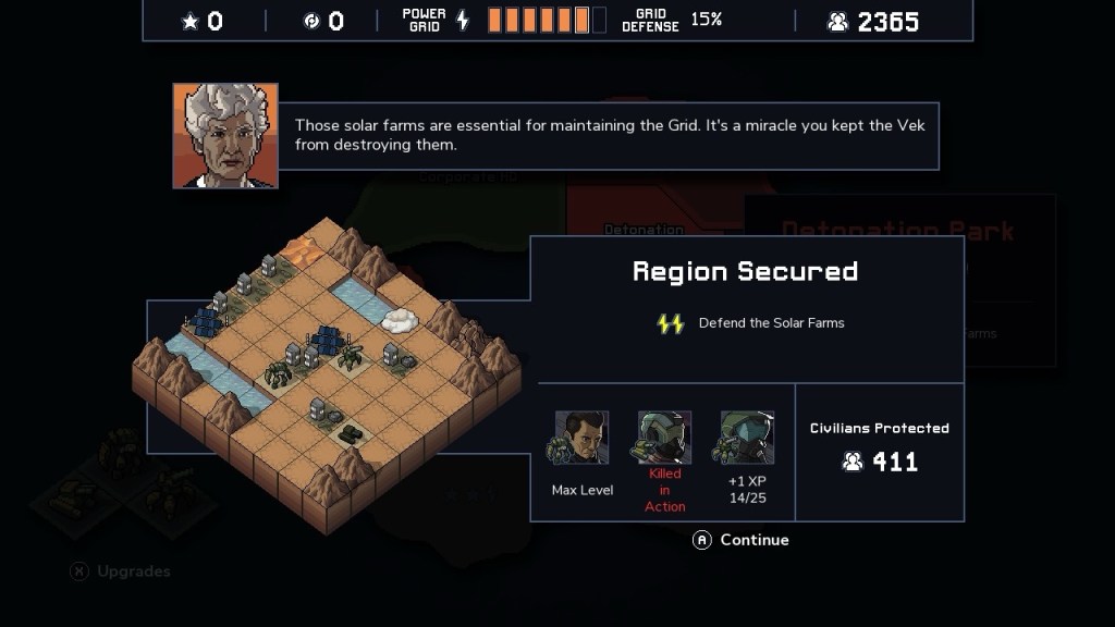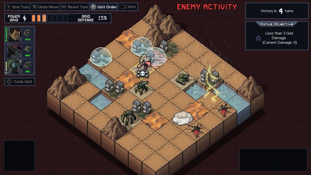 You are tasked with liberating four islands where they are split into separate procedurally generated missions for each run. So no two games are the same where you are tasked with defending civilians or the grid which if buildings are destroyed and it reaches zero you lose.