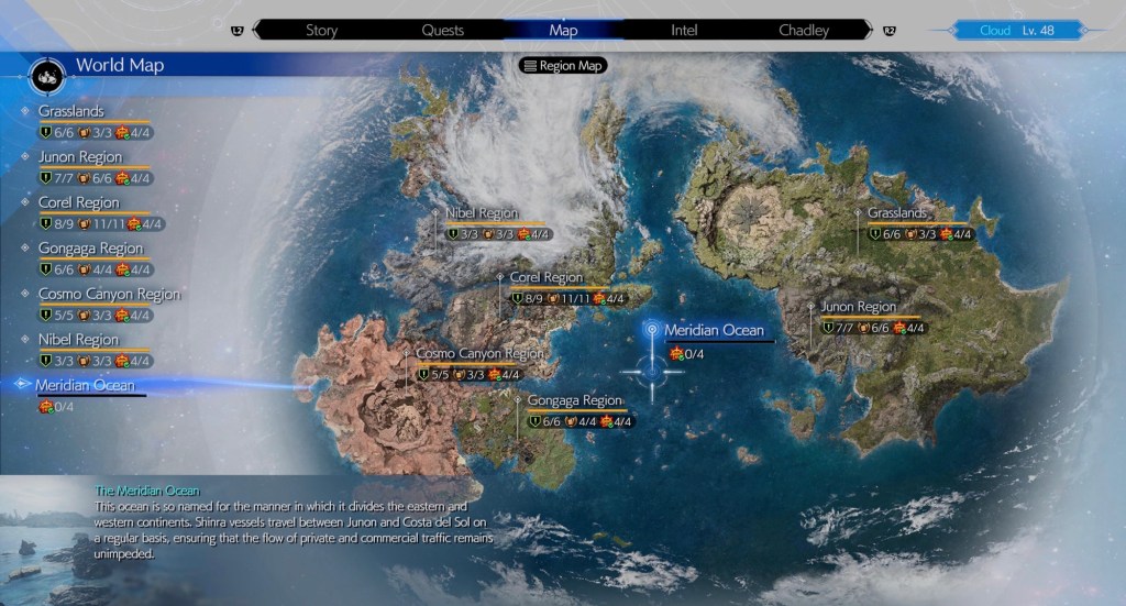 The game world covers nearly all of the planet this time rather than just the linear Midgar of remake. Now rather then being a complete open world it’s more of a connected up overworld with self contained open areas. Now you get Chocobos to run around faster which each come with their own terrain specific abilities which help traverse the grasslands or desert of Cosmo Canyon. I think this game looks phenomenal and not just graphically. I think some may disagree but the sheer level of detail and effort gone into each areas design is outstanding. From lush pastures, to thick forest encompassing ancient ruins or the rocky terrain lording above the desolate desert below. Or the chilled summer vibes from the beach resort at Costa Del Sol.