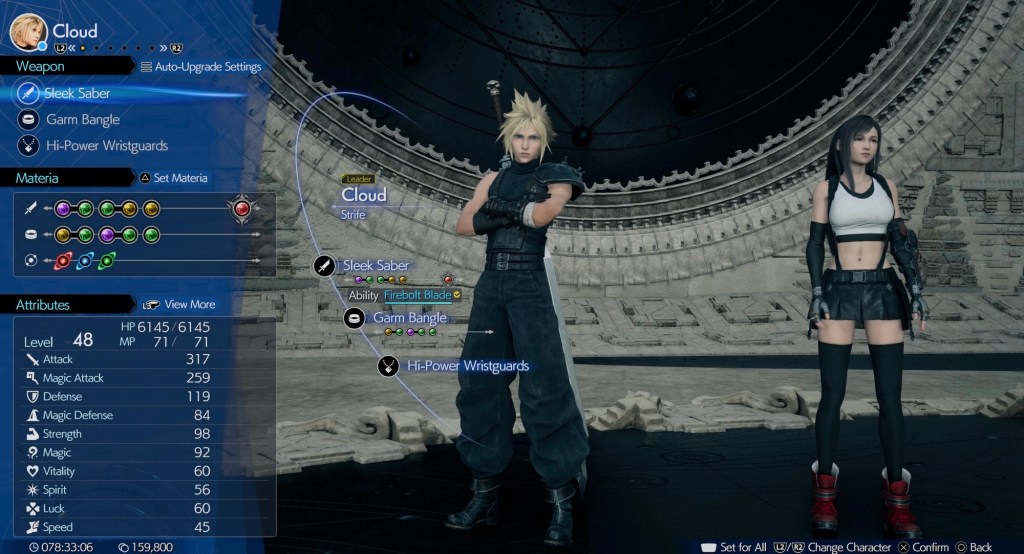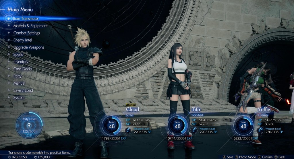 The party comprises of Cloud, Tifa, Aerith, Barrett, Red XIII, Yuffie and Cait Sith with the remaining Cid And Vincent being present but not playable. I think this game does a real service to making them all stand out as well as when controlled in combat all of them feel like they could be the protagonist of any JRPG series themselves. My party usually consisted of Cloud, Tifa and Yuffie and Using Tifa as the main heavy.