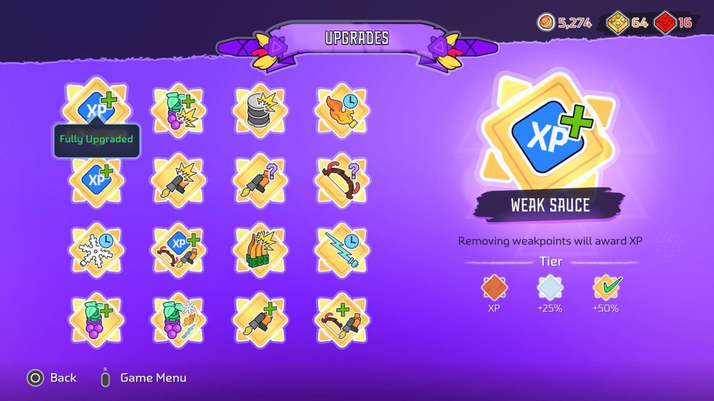 I will say you can pickup gadgets and special weapons during the missions themselves. They are ammo limited and mostly not great either. Oddly the best one is a random hot dog cart summon which throws explosive hot dogs. The only returning weapon from the mainline series is the tripcaster which is even weirder considering the main games have a variety of weapons that should’ve been included. You do have focus powers which reveal weak points but you can still damage those without activating it. The characters get buffs every level increase, extra hearts, more damage etc. As well as the option to buy upgrades which can grant longer status effects, higher spawn rate of better gadgets and increased ammo capacity. But I imagine you could probably coast through the entire game ignoring them mostly.