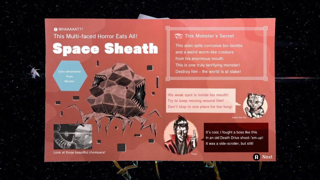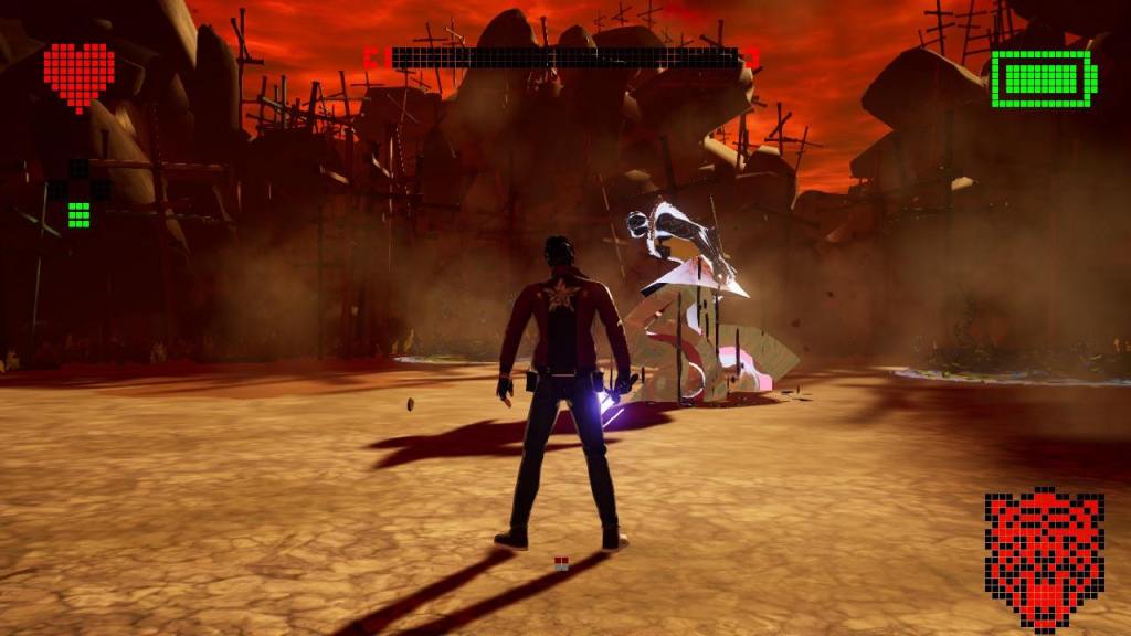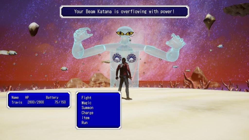 One thing this game series has always done astoundingly well are boss fights and this entry is no different. As always you are aiming to climb the ranks in the UAA rankings to become number 1. This time it’s against invading aliens lead by FU. Each alien has their own boss area, one or two die due to story related so you don’t get to fight them, but they have nice nods to other older games, like final fantasy, smash bros, streets of rage or old text scrolling games. With the final fight against Fu being a really cool two stage fight where you end up in his own weird neon mirror world. What adds to all this and the lead up to the fights is the dialogue which is in a league of its own and Travis Touchdowns voice actor Robin Atkin Downes always knocking it out of the park. Great timing on delivery, and the breaking of the fourth wall on the regular adds to great moments. How he is always going on about anime, his favourite Takashi Miike films and series, with his favourite being Gozu. Which I’d admit for a long time me and my friend thought that was some weird fever dream we experienced together but it is full film, which I can only press for you the readers to experience on your own. Or when he’s trying to console his apprentice Shinobu after having her arms ripped off about his favourite NJPW fights he saw. I just find Travis to be a great written character which would be hard to confuse with anyone else.